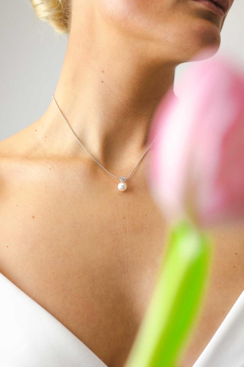 De Julia Necklace is een subtiele maar chique ketting met een klassieke uitstraling. Deze bruidsketting heeft een enkele Swarovski-parel met daarboven drie kleine kristallen. De Julia Necklace is perfect te combineren met de Julia Pareloorbellen, of met andere sieraden om je eigen look te creëren op je trouwdag. De Julia ketting is verkrijgbaar met rhodium, 14kt goud of roségouden plating.