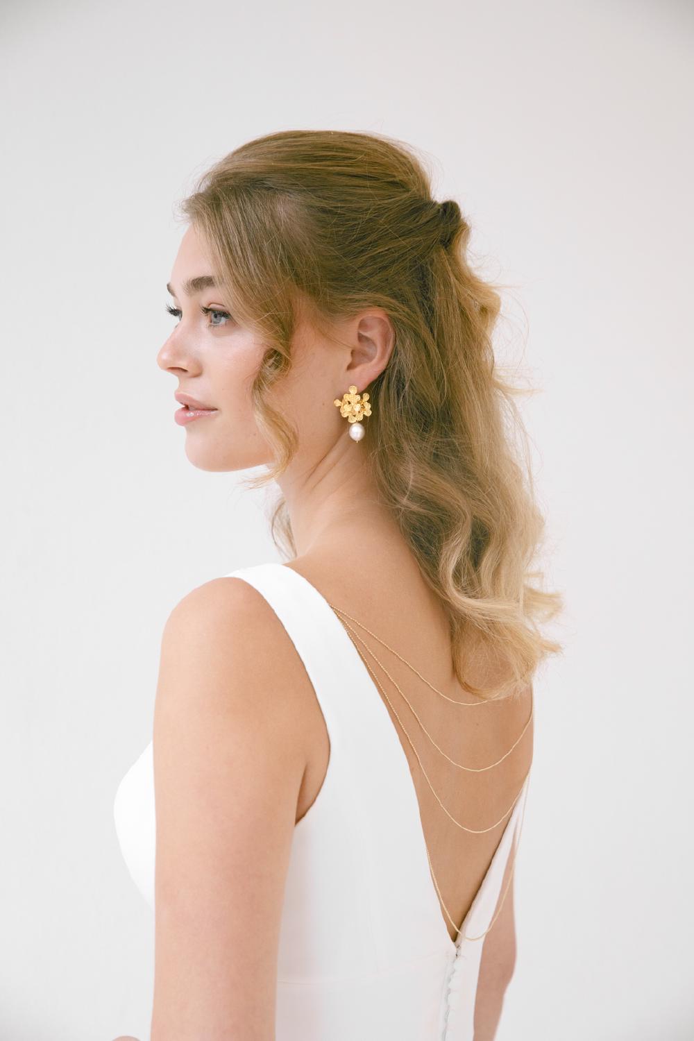 Een uniek sieraad ontworpen om de achterkant van jouw bruidslook te versterken. De Sands Rugketting is perfect voor bruiden die de elegantie van een ketting willen, zonder de aandacht van de voorkant van hun jurk af te leiden. Ontworpen om langs je rug te vallen, met twee sluitingen aan beide zijden die vastgemaakt worden aan kleine lusjes aan de binnenkant van de schouderbanden van je jurk. Let op: dit betekent een kleine aanpassing aan je jurk, maar elke bruidsstylist (of handige oma) kan dit mogelijk maken. Het is een prachtig detail voor jouw grote dag.
