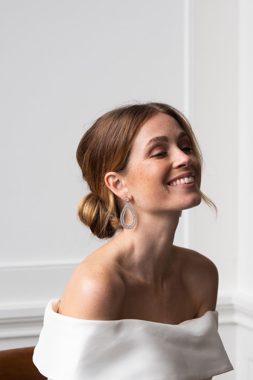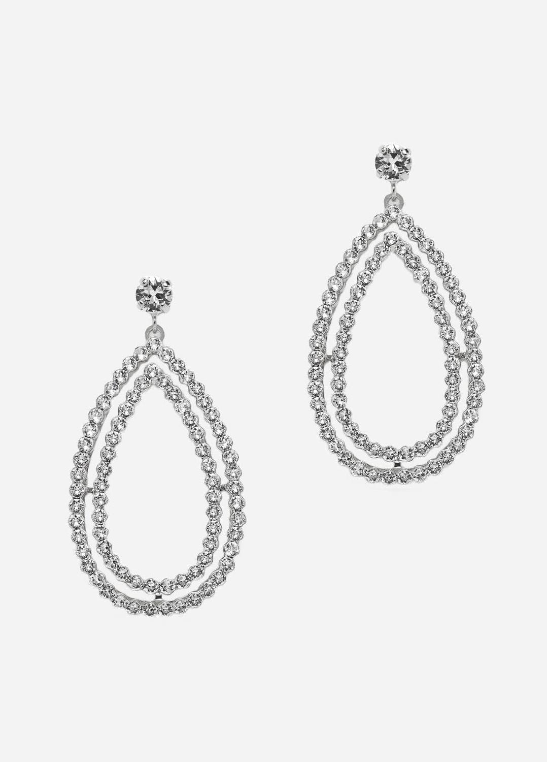 De Grace Oorbellen zijn prachtige statement oorbellen voor je bruiloft. Deze elegante bruidsoorbellen hebben een dubbele druppelvormige hoepel ingelegd met kleine kristallen, en zijn verkrijgbaar met een rhodium, 14kt goud of roségouden plating.