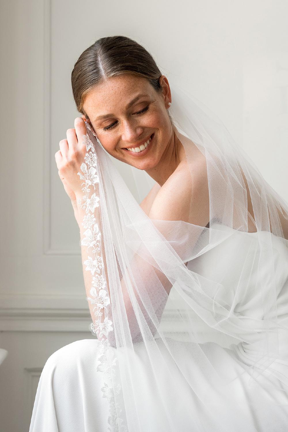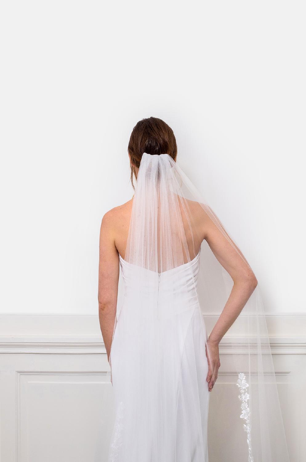 De kanten bloemen beginnen pas ter hoogte van de taille op de sluier. Op deze manier neemt de sluier geen aandacht weg van je prachtige bruidsjurk, sieraden en make-up.