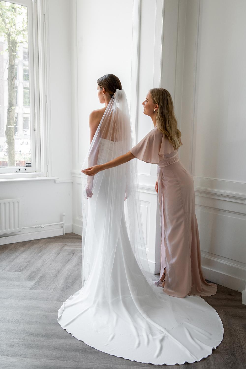 De kristallen zijn aan de rand van de tule geplaatst en beginnen vanaf de kam tot aan het einde van de sluier. De glinsterende kristallen voegen een romantische touch toe aan je bruidslook en laten je stralen op je speciale dag.