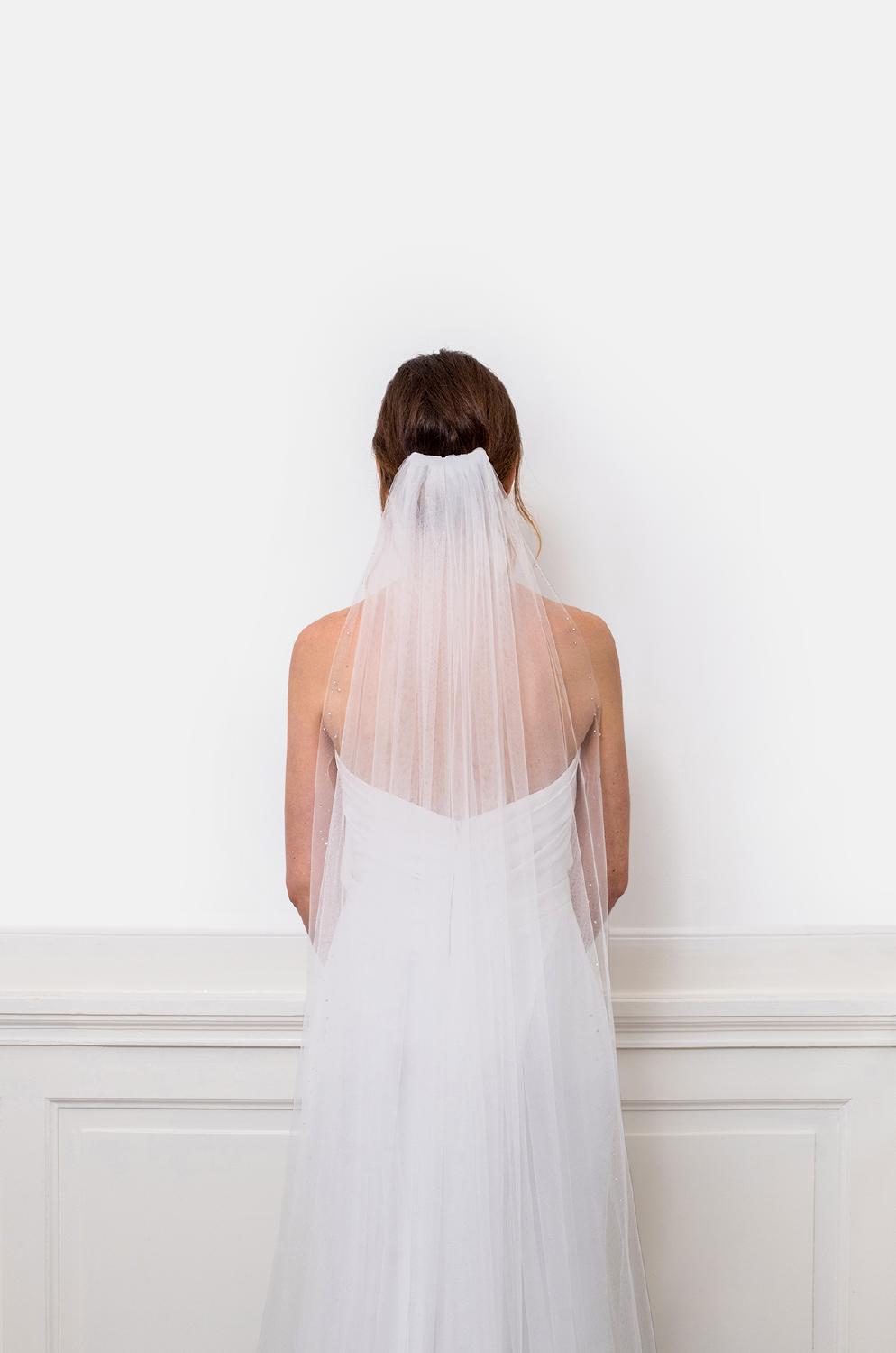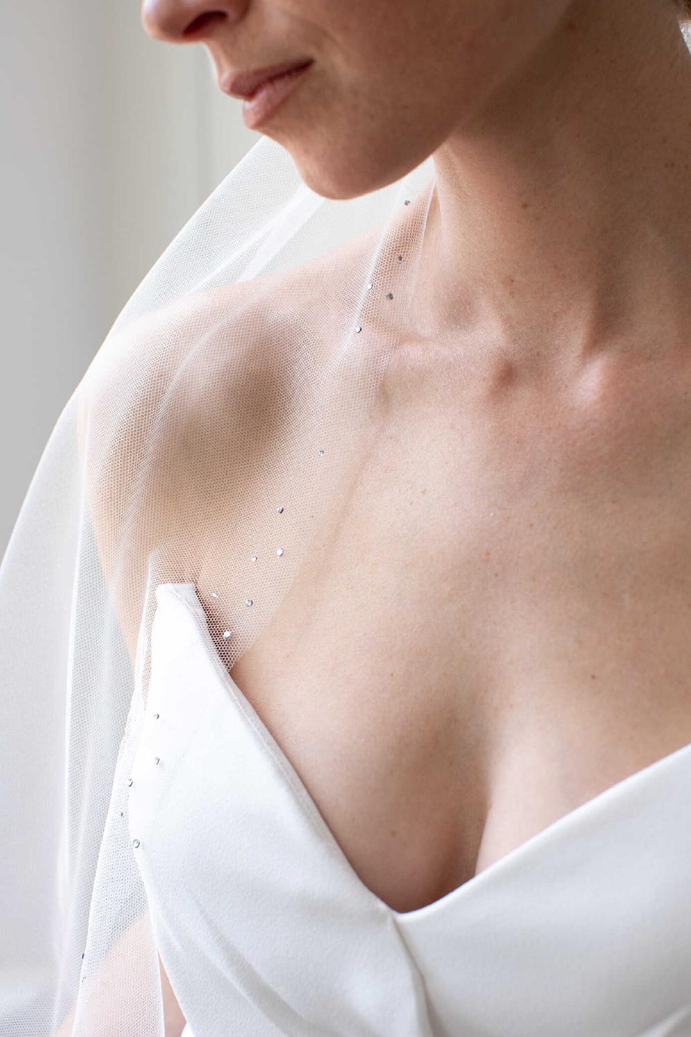 Ontdek Rosita, een prachtige sluier met kristallen, gemaakt van ivoorkleurig Italiaans tule. De kleine, subtiele kristallen zijn zeer zorgvuldig aan beide zijden van de tule bevestigd, zodat de kristallen altijd mooi in zicht zijn.