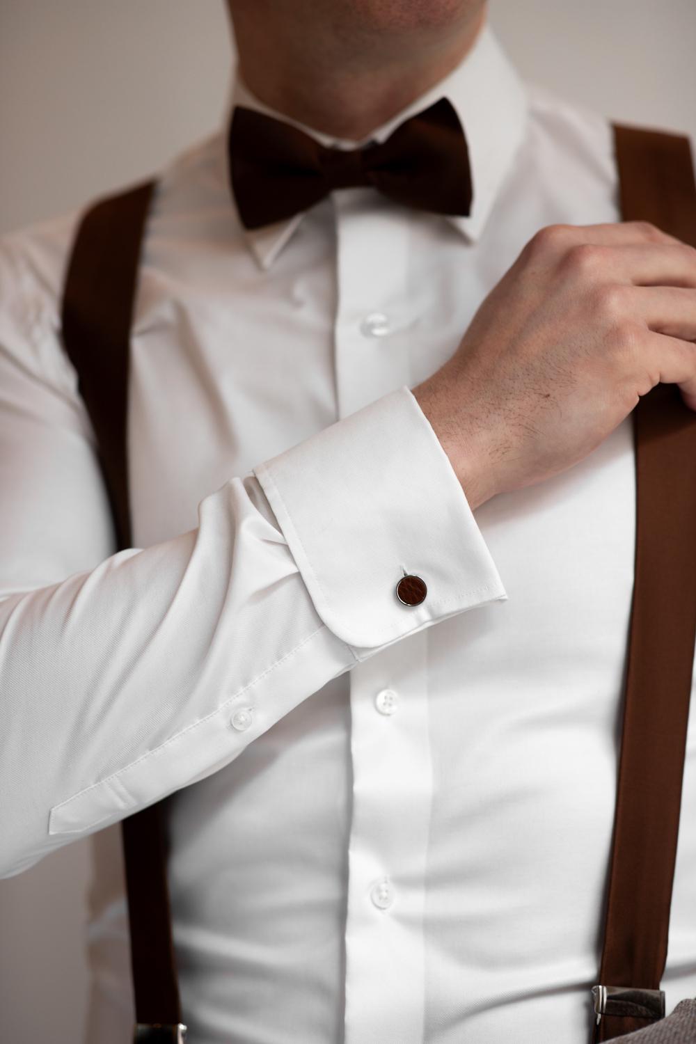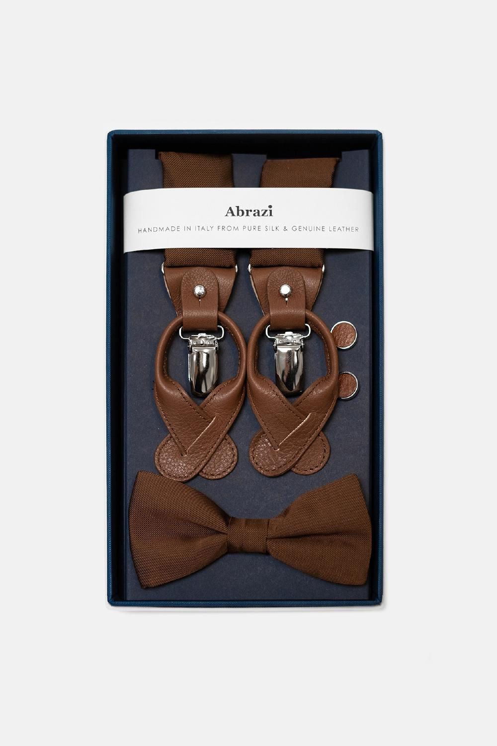 De Abrazi Bretel Set bestaat uit handgemaakte Y-back bretels die kunnen worden gedragen met metalen clips of met knopen, een bijpassende vlinderdas van 100% zijde, een pochet, en een paar leren manchetknopen. Handgemaakt in Italië van pure zijde en echt leer. De Bretels Set is verkrijgbaar in zes verschillende kleuren, een geweldige keuze voor elke bruidegom, getuigen of stijlvolle man.