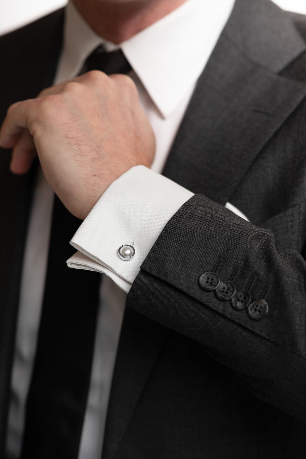 Abrazi's Parel Manchetknopen, verkrijgbaar in drie verschillende kleuren, zijn een elegante aanvulling op de stijl van iedere heer of bruidegom. Deze zilverkleurige manchetknopen zijn gemaakt voor de herencollectie van Abrazi van gerhodineerd messing en hoogwaardige Swarovski-parels.