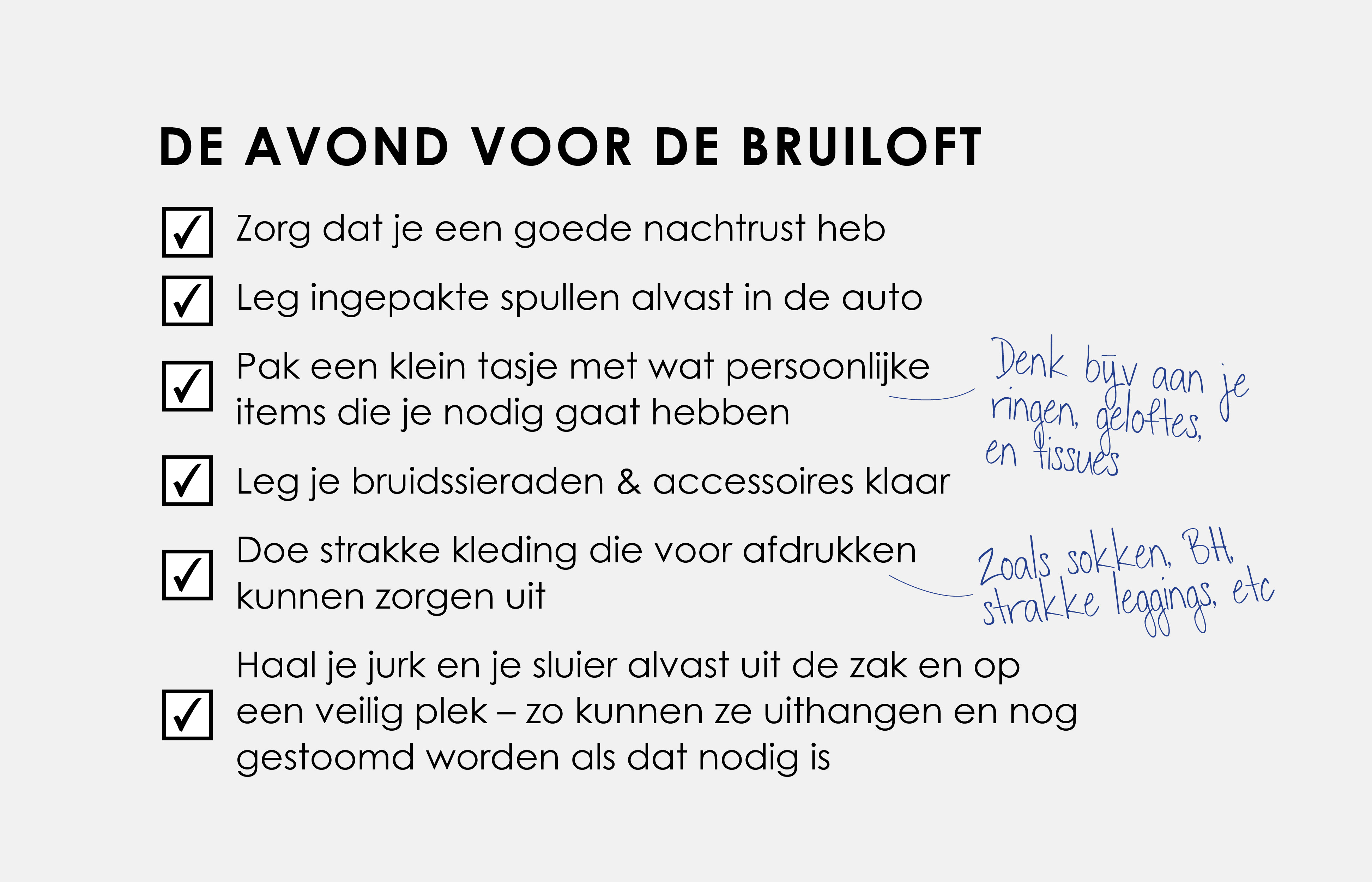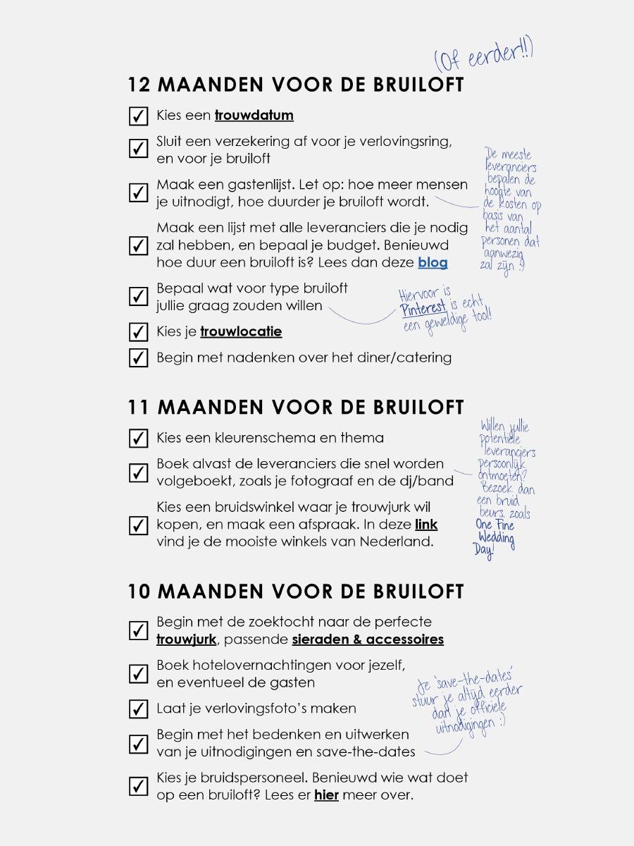 Uiteraard zijn de tijdsindicaties in deze checklist maar een tip, jij bepaalt uiteindelijk of en wanneer je bepaalde keuzes maakt. Het is jouw bruiloft!