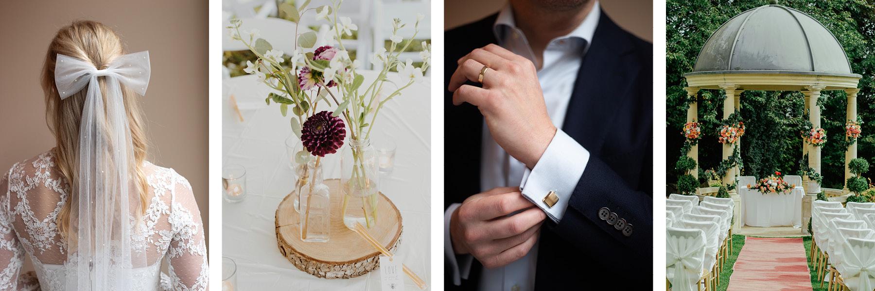 Kleding: Dit omvat de trouwjurk voor de bruid, het trouwpak voor de bruidegom, en de bruidssieraden, de bruidssluier, schoenen en accessoires voor beiden.