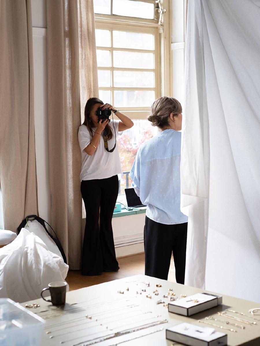 “Wat ik nu draag, de Thin Magic Chain in het goud. Ik heb hem ook in het zilver en in de dikke variant. Ook zijn de pareloorbellen met het gouden schijfje een favoriet van mij, de Olga parel oorbellen.